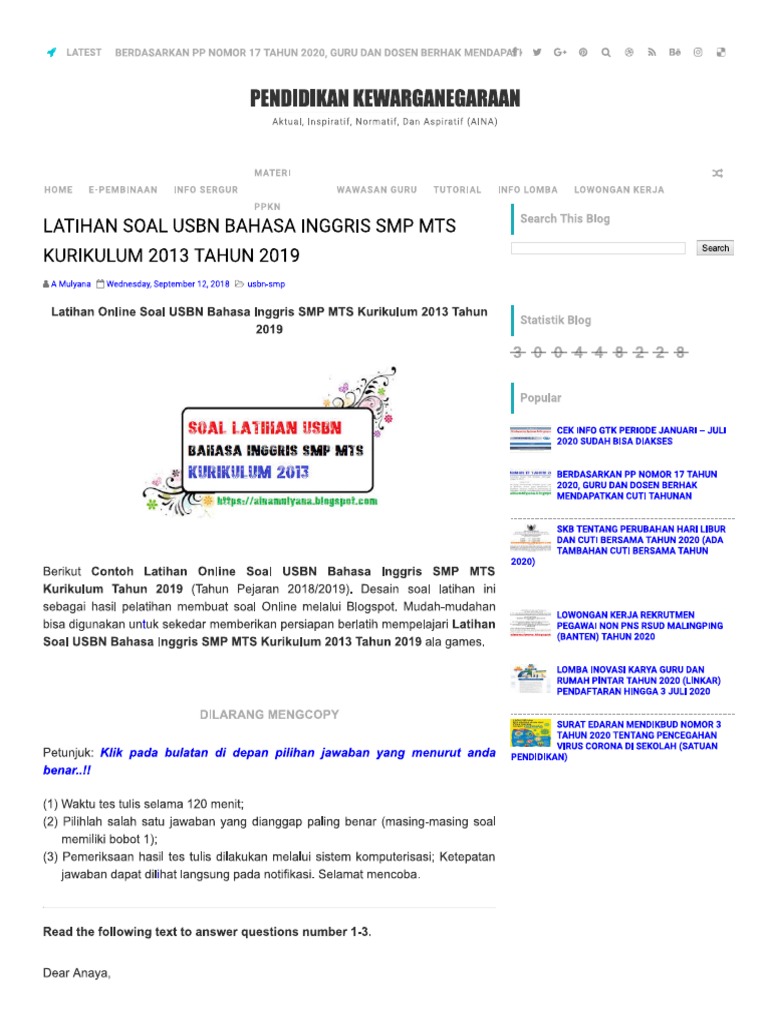 Bocoran soal dan kunci jawab un 2019/2020 smp, sma/smk semua jenjang. Soal dan jawaban latihan ujian sekolah (us uas) smp tahun 2021 (tahun pelajaran 2020/2021). Soal usbn bahasa inggris kurikulum 2013. Sebagai credit kepada owner dari konten ini. Download soal un bahasa inggris smp tahun 2018 2019 admin 29 08 2019 uncategorized 4 komentar bukan hanya pada proses pelaksanaannya. Berikut adalah beberapa soal bahasa indonesia yang mungkin saja keluar saat un 2019 nanti : Cara mencari bocoran soal un 2020 bisa lewat google drive, foto.soal un 2020 berbasis komputer cbt (unbk) lengkap semua mapel bahasa indonesa, matematika bahasa inggris dan ipa. Soal dan kunci jawaban unbk geografi 2019 no 1 5. Home › soal un bahasa inggris smp › soal unbk smp. Soal dan kunci un bahasa inggris sma tahun 2018. Demikian soal latihan un smp bahasa inggris kali ini yang telah kami update beserta kunci jawabannya, semoga bermanfaat bagi anda.