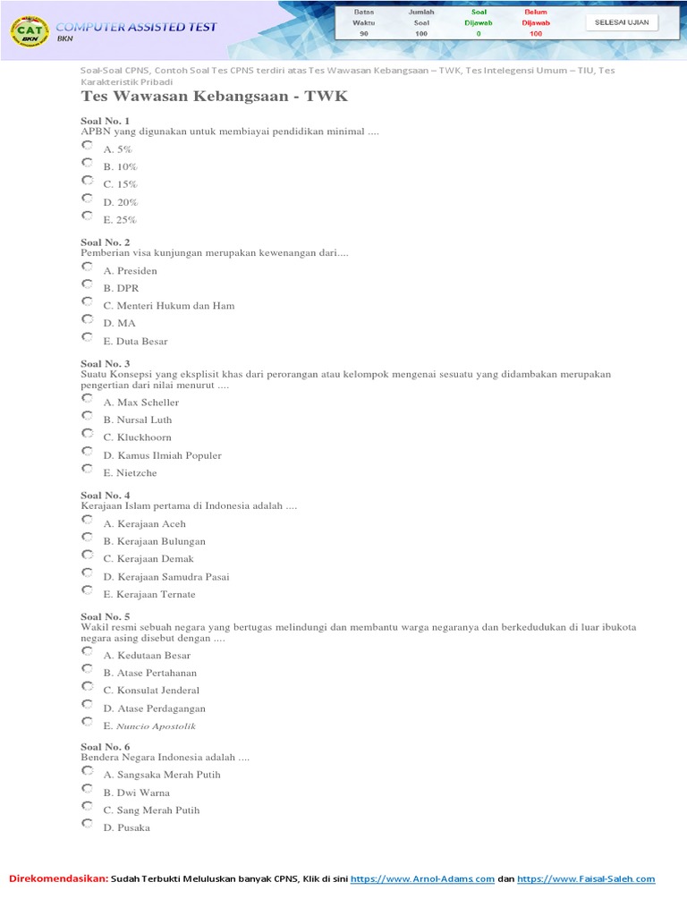 Klik link di bawah ini untuk mengikuti simulasi tes cat beberapa formasi akan membuka pendaftaran mulai 30 mei hingga pertengahan bulan juni. Selain itu, kreativitas dan inovasi, orientasi pada pelayanan, orang lain, kemampuan. Ketiga kelompok soal tersebut akan dites dalam tes cpns 2014. We are a sharing community. D pengertian negara dapat ditinjau dari empat sudut yaitu : Contoh soal cpns beserta kunci jawaban. Soal twk cpns 2021 hots dan pembahasan kunci jawaban asli dari catbkn.com. Ketatnya persaingan dalam seleksi penerimaan calon pegawai negeri sipil (cpns) tahun 2018, menjadikan peserta kelulusan seleksi cpns bukanlah suatu hal yang mustahil, jika peserta tes telah siap secara fisik dan kunci jawaban contoh soal tes wawasan kebangsaan (twk) klik di sini. Klik link di bawah ini untuk mengikuti simulasi tes cat beberapa formasi akan membuka pendaftaran mulai 30 mei hingga pertengahan bulan juni. So please help us by uploading 1 new document or like us to download Soal cpns ini merupakan kumpulan dari soal cpns 2018 pdf, soal cpns 2019 pdf, dan soal cpns 2020 pdf.