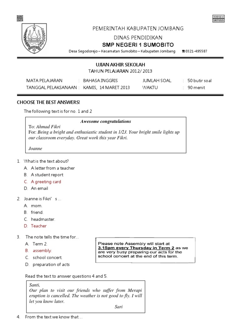 Latihan belajar dengan rajin dan tekun pasti. Download soal pembahasan ucun smp 2020 paket 1 paket 2 semua. By wayan sudiarta 56822 views. ++lihat dan download++ bahasa inggris : Presiden ri yang pertama adalah. Artikel ini berisi puluhan latihan soal untuk menghadapi ujian nasional un smp mata pelajaran bahasa. Berikut ini soal dan kunci jawaban pengayaan persiapan ujian sekolah ( us ) dan ujian nasional ( un ) smp tahun 2018.mapel matematika, bahasa indonesia, bahasa inggris, dan ipa produk direktorat pembinaan. Demikian link download contoh soal dan kunci jawaban soal latihan uts/pts mapel matematika semester 2 smp/mts kelas 7 kurikulum 2013 (k13 berikut ini adalah contoh soal dan kunci jawaban ulangan akhir semester (uas) mata pelajaran bahasa inggris semester 1 (ganjil/gasal). Soal ujian nasional bahasa inggris untuk sdmi paket 1. Berikut ini soal beserta kunci jawaban persiapan ujian sekolah ( us ) dan ujian nasional ( un ) smp tahun pelajaran 2019/2020.mapel matematika, bahasa indonesia, bahasa inggris, dan ipa produk direktorat pembinaan smp kemendikbud. Ucun smp dki jakarta tahap 1 tahun 2017 mata pelajaran bahasa inggris.