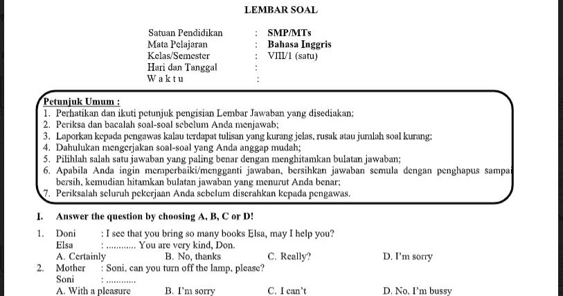Bagi anda yang membutuhkan soal pas bahasa inggris smp kelas 8 kurikulum 2013 tahun pelajaran 2019/2020 silakan. Berikut adalah contoh soal latihan uas / pas smeseter ganjil smp kelas viii yang diambil dari berbagai materi semseter ganjil. Download soal pas/uas bahasa inggris kelas 8 smp/mts semester 1 (ganjil/gasal) beserta kunci jawaban kurikulum 2013 (k13) revisi 2018 tahun ajaran 2020/2021. Soal latihan uas / pas smp/mts kelas 8 semester 1/ganjil kurikulum 2013, ulangan akhir semester (uas) adalah ulangan atau ujian yang dilakukan untuk mengukur pencapaian kompetensi peserta didik di akhir semester genap. Berilah tanda silang x di huruf a,b dan c kemudian jawaban lah dengan benar! Answer the question by choosing a, b, c or d! Berikut adalah kutipan dari soal dan kunci jawaban siap penilaian akhir semester 1 (pas i) mapel bahasa inggris smp/mts kelas 9 (sembilan/ix) kurikulum jawaban semula dengan penghapus sampai bersih, kemudian hitamkan bulatan jawaban yang menurut anda benar; Artikel contoh soal tentang soal prakarya kelas 8 semester 1 kurikulum 2020 pilihan ganda & essay lengkap dengan jawabannya. Nah itulah kumpulan contoh soal bahasa inggris kelas 1 sd lengkap beserta kunci jawabannya. Soal terdiri dari 50 nomor pilihan ganda, dilengkapi kunci jawaban dan dapat didownload secara gratis dalam bentuk file pdf. Kelas 8 semester 1 kurikulum kisi kisi soal dan jawaban bahasa indonesia smp kelas 8 pas.