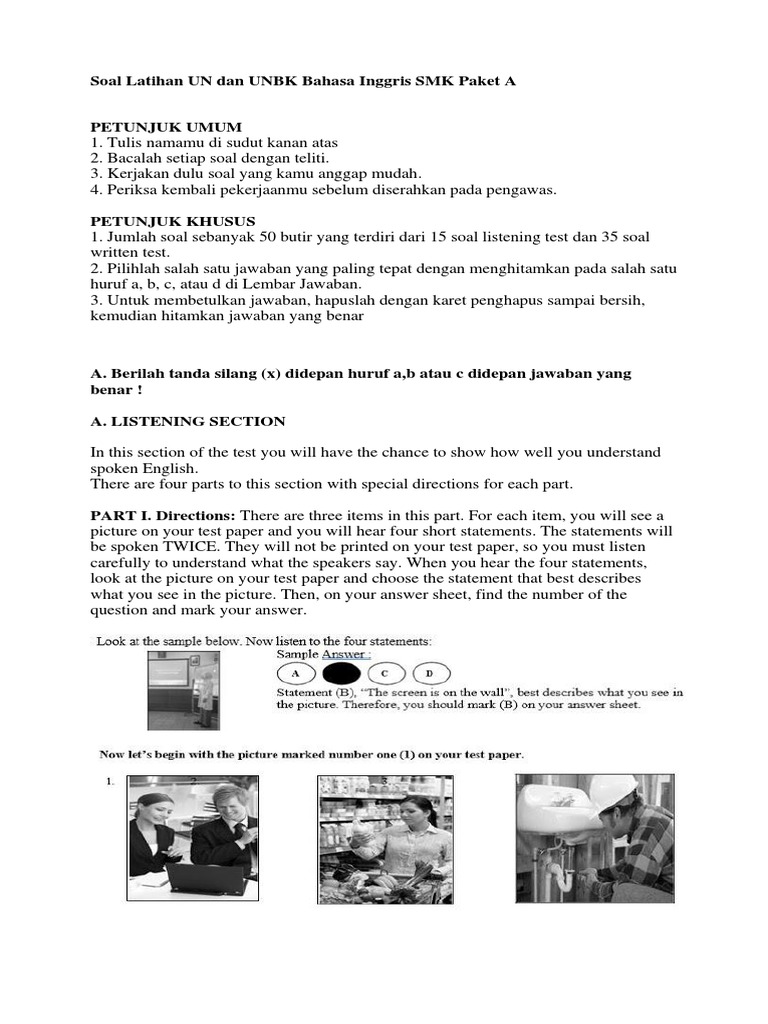 Apalagi memahami text yang dibaca oleh native speaker lebih sulit lagi. Pilihlah salah satu jawaban yang paling tepat dengan menghitamkan pada salah. Soal dan kunci jawaban bahasa inggris kelas 12. Salah satu kebijakan pemerintah mengenai ujian nasional yaitu digantikannya un dengan asesmen kompetensi minimum serta survei karakter mulai tahun 2021. Kegiatan mendengarkan khususnya lagu, dialog, berita, podcasts dalam bahasa inggris akan melatih pendengaran kita khususnya dalam bahasa inggris. Jumlah soal sebanyak 50 butir yang terdiri dari 15 soal listening test dan 35 soal written test. Jumlah soal sebanyak 50 butir yang terdiri dari 15 soal listening test dan 35 soal written test. Soal latihan usbn bahasa inggris sma ma smk cara sunda. Berikut bospedia memberikan soal latihan un dan unbk bahasa inggris smk paket a. Apalagi memahami text yang dibaca oleh native speaker lebih sulit lagi. Tape script paket 1 listening erlangga express un 2019 smk.
