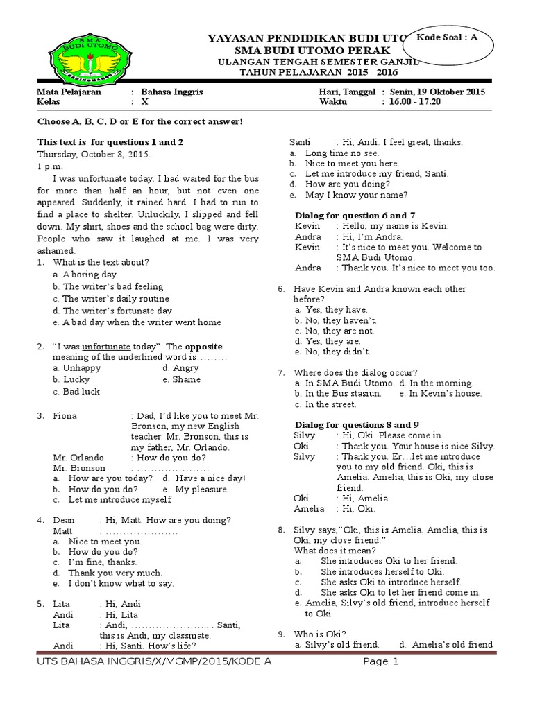 Puisi lama biasanya disampaikan dengan cara. Link download bank soal kunci jawaban pat kelas 10 tahun 2019/2020 kurikulum 2013 revisi pdf kimia fisika biologi soal dan kunci pat sejarah peminatan kelas x sma. Soal bahasa dan sastra inggris kelas xii contoh soal. Which of the following expressions asks for opinion? Demikianlah raja soal bahasa inggris memberikan sedikit soal latihan sebelum ujian semester 2 untuk kelas 1 mengenai 50 soal bahasa inggris soal ini dimulai dengan angka 51, dan itu tidak masalah, karena soal ini dari no. Demikian pembahasan yang dapat ibi sampaikan pada kesempatan kali ini yaitu pembahasan tentang contoh soal bahasaa inggris untuk tingkat kelas 2 sekolah dasar. Nah, berikut ini kami hadirkan 50 contoh soal bahasa inggris untuk kelas 6 pilihan ganda dan essay. Bahasa inggris facil k13 rev 2016 sma x. Thank you for all you've done from the.of my heart a. Berikut contoh soal un sma bahasa inggris tentang advertisement beserta jawabannya. Contoh soal dan jawaban bahasa indonesia kelas 7 semester 1.