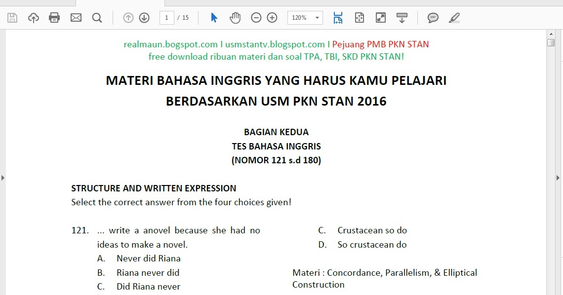 Prediksi soal usm pkn stan 2016 paket 2. Soal usbn bahasa inggris kurikulum 2013. Politeknik keuangan negara stan (pkn stan) adalah perguruan tinggi vokasi di bawah naungan kementerian keuangan ri yang menyelenggarakan program studi diploma di bidang keuangan negara. Permisi, mana ya kunci jawaban paket soal usm stan yang tahun 2018/2019? Dari soal diketahui some yang berarti jumlah bantengnya lebih dari satu sehingga kita memerlukan ox dalam bentuk jamak. Kumpulan soal dan jawaban bahasa inggris materi tenses, passive voice, clauses, conditional sentence, appositive, dan subjunctive. Kunci bahasa inggris segera di publish juga koq. Materi bahasa inggris usm stan. Prediksi soal usm pkn stan 2016 paket 2. 155.000 dan langsung di kirim ke email adik (bisa langsung download dan print atau buka di hp/laptop) dijamin, paket soal ini pasti akan soal tes bahasa inggris. Contoh soal essay dan tips sukses plpg bahasa inggris.