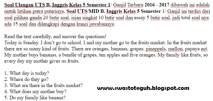Pada kesempatan ini ibi akan membahas maeri tentang soal latihan bahasa inggris untuk klas 5 sekolaah dasa. Choose the correct answer and then match your answer by clicking the correct answer key in the spoiler box below the options. Tapi pembahasannya berfokus pada task 2: