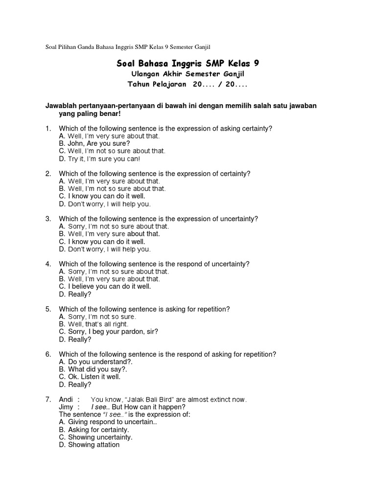 Soal dan kunci jawaban siap penilaian akhir semester 1 (uas i) mapel bahasa inggris smp/mts kelas 9 (sembilan/ix) kurikulum 2013 diharapkan dapat menjadi rujukan bagi peserta didik untuk mempersiapkan diri menghadapi penilaian akhir semester i khusus materi mapel bahasa inggris. Tulisan berwarna merah adalah kunci jawaban. 50 soal bahasa indonesia dan jawaban. Kunci jawaban bahasa inggris smp kelas 9 semester ganjil. Soal bahasa inggris kelas 9. Soal dan jawaban kali ini akan membahas mengenai soal bahasa inggris untuk sobat pelajar smp kelas vii (kelas 7). Soal+jawaban ipa kelas 9full description. .soal bahasa inggris kelas x. Soal pts ini berbentuk pilihan ganda dan belum tersendia kunci jawaban, jadi adik adik bisa kerjakan dirumah atau berikut bospedia memberikan soal uts/pts bahasa inggris kelas 9 smp/mts. Download soal latihan ujian sekolah (us/usbn) bahasa inggris smp kurikulum 2013. Kumpulan soal pas atau uas smp/mts kelas 9 semester 1/ganjil kurikulum 2013 dan ktsp tentunya hanya sebagai latihan untuk menghadapi penilaian akhir semester (pas) atau uas yang sebentar lagi kan dilaksanakan.