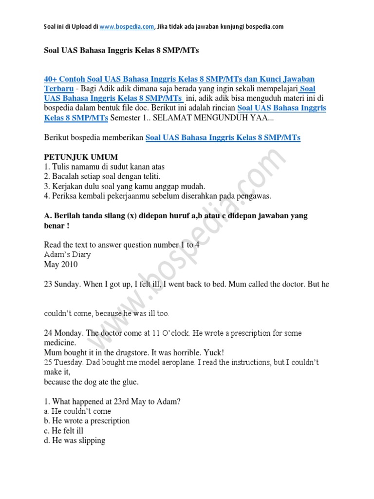 Soal bahasa inggris kelas 9. Contoh soal dan jawaban administrasi kepegawaian. Answer the questions by crossing (x) a, b, c, d, or tertulis jawaban dari blog ini c. Choose the best answer by crossing (x) a, b, c, d, or e! Untuk membantu kalian dalam belajar, berikut adalah contoh soal uas bahasa inggris kelas 6 semester 2. Pilihan ganda bahasa inggris kelas 11 semester satu dengan kunci jawaban bagian ketiga yang sedang anda baca merupakan lanjutan contoh soal pg bahasa inggris kelas xi semester 1 beserta jawabannya bagian kedua soal nomor 16 30. Berikut ini ibi akan memberikan conntoh soal bahasa inggriss untuk siswa sekolah dasar kelas 1 berserta kunci jawabannya. Inggris kelas 10 berikut di bawah ini, contoh soal b. Demikkian penjelasan tentang tema yang dibahas oleh ibi pada keseempatan kali ini yaitu tentang contoh soal bahasa inggrisuntuk kelas ssatu sekolah dasar. Soal dan kunci tanggapan memelihara sistem ac. 50 contoh soal bahasa inggris pilihan ganda dan essay lengkap dengan kunci jawaban.