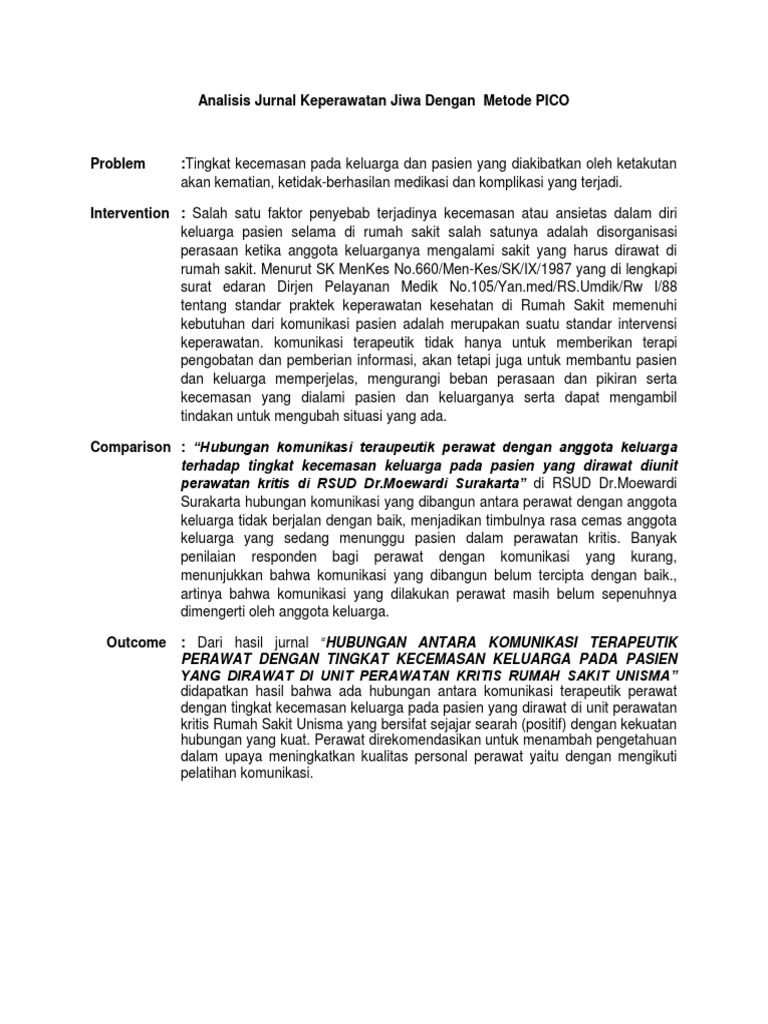 Analisis jurnal metode pico kritisi jurnal metode pico pengaruh teknik relaksasi genggam jari terhadap perubahan skala nyeri pada pasien post operasi sectio caesarea di rsud prof. Analisis pico jurnal (dlm bentuk tabel) Menelaah journal dengan metode picot. Kriteria p (patient/clinica l problem). Seorang wanita setengah umur datang ke rumah sakit dengan keluhan nyeri perut bagian ats yang menjalar ke punggung dan sudah diderita selama 3 hari.pada pemeriksaan didapatkan epigastriumnya keras dan nyeri tekan.kadar lipase dalam serum meningkat dengan tajam.dibuat diagnosis pankreatitis akut di igd Bersikap caring atau peduli pada pasien bedah dan meningkatkan perawatan yang tersedia untuk meningkatkan kepuasan pasien. Contoh analisis jurnal keperawatan menggunakan metode pico (3) october 2, 2017 october 21, 2017 hukumkesehatanblog aside analisis jurnal tags: Pubmed sendiri merupakan bank atau basis data dari referensi dan abstrak dengan topik ilmu pengetahuan alam dan biomedis (medline) yang dikelola oleh united states national library of medicine (nlm) pada national institutes.