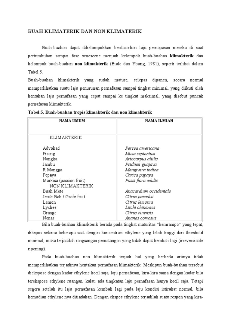 Sedangkan perbedaan buah buah non klimaterik, karbon dioksida yang dihasilkan pada buah terus menurun secara perlahan sampai ke proses pelayuan. Pengaruh mana tidak terjadi terhadap buah pisang (will et al., 1982). Sifat hasil tanaman buah dapat dikelompokkan berdasarkan aktivitas respirasinya yaitu klimakterik dan non klimakterik. Buah klimakterik adalah buah yang mengalami lonjakan respirasi dan produksi etilen Buah klimakterik biasa dipanen tua, karena proses pematangan dapat terjadi sendiri. Arah pergeseran respirasi yang khas untuk buah non klimakterik mungkin akan ditunjukkan pada umur fisiologis atau dalam penyimpanan yang sesuai. Sedangkan buah non klimaterik tidak menunjukkan adanya kenaikan laju respirasi, buah non klimakterik juga menghasilkan sedikit etilen dan tidak memberikan respon terhadap etilen kecuali dalam hal degreening (penurunan kadar klorofil) pada jeruk dan nanas. Buah klimakterik dan buah non klimakterik. Selain masih melakukan proses biokimia, jeruk juga. Contoh buahbuahan yang tergolong ke dalam kelompok buah nonklimaterik ialah semangka, jeruk, nenas, anggur, ketimun dan sebagainya. Dalam kulit buah terdapat zat pektin, tannin, katechin, rosin, zat warna, dan getah berwarna kuning (cahyono, 2011). Buah buahan jenis klimakterik yang sudah. Klimaterik dapat diartikan sebagai keadaan buah yang stimulasi menuju kematangannya terjadi secara auto (auto stimulation).