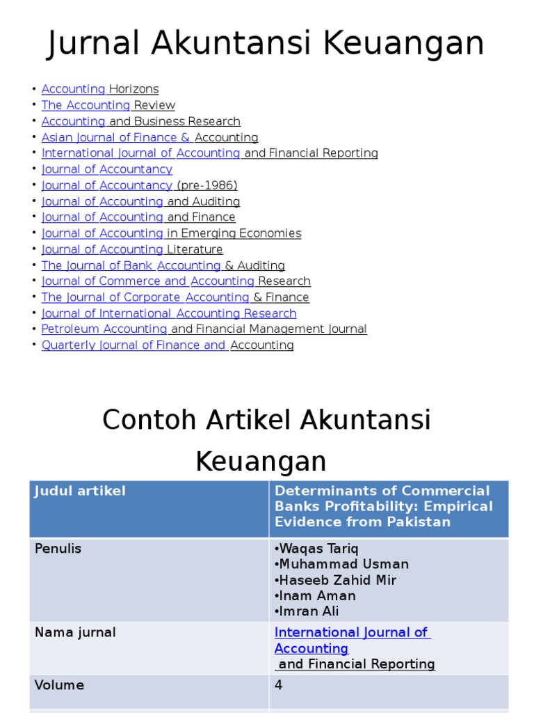 Jurnal akuntansi dan keuangan, vol. Sebagai contoh sederhana, tekanan untuk memenuhi ekspektasi jangka pendek bursa saham atau target keuangan akhir tahun mungkin menjadi penyebab terjadinya aktivitas creative accounting oleh perusahaan. Jurnal akuntansi internasional jurnal akuntansi international. Jurnal ini memuat paper ilmiah di bidang ekonomi moneter keuangan perbankan regulasi makroprudensial sistem pembayaran ekonomi internasional ekonomi pembangunan dan pertumbuhan ekonomi. Tujuan utama jurnal ini adalah untuk bertukar pikiran tentang akuntansi, investasi, keuangan, dll. Contoh makalah laporan, contoh makalah ips kelas 7, contoh makalah karya tulis ilmiah yang baik dan benar, semua contoh surat ini bisa anda download secara gratis. Demikianlah pembahasan mengenai jurnal eliminasi konsolidasi yang perlu anda ketahui saat menyusun laporan keuangan. Bagi yang baru pertama kali mencari referensi jurnal internasional, mungkin masih belum terbanyang seperti apa konten di dalamnya.
