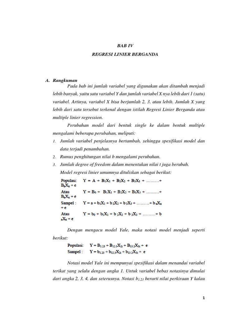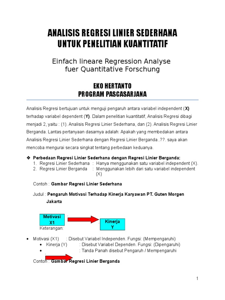 Pengertian dan contoh soal regresi linier berganda statmatid analisis regresi linier berganda adalah hubungan secara linear antara dua atau lebih variabel independen x 1 x 2x n dengan variabel dependen yanalisis ini untuk mengetahui arah hubungan antara variabel independen dengan variabel dependen apakah masing masing variabel independen. Jurnal gammath, volume 2 nomor 1, maret 2017 27 analisis kesulitan regresi linier berganda 3 variabel nely indra meifiani 3)1), hari purnomo susanto2), urip tisngati pendidikan matematika, stkip pgri pacitan email: Algoritma regresi linier berganda analisis yang memiliki variabel bebas lebih dari satu disebut analisi regresi linier berganda. Regresi berganda analisis data mengenai pengaruh variabel return on equity (roe), earning pershare (eps), price earning ratio (per) dan debt to total asset (dta) mempunyai pengaruh yang signifikan terhadap return saham pada perusahaan jasa transportasi yang terdaftar di bursa efek jakarta (bej) tahun 2003 sampai 2005. Analisis regresi linier berganda ini digunakan untuk memprediksi berubahnya nilai variabel tertentu bila variabel lain berubah. Analisis regresi linear berganda kegunaan analisis regresi linear berganda analisis regresi linear berganda digunakan untuk mengukur pengaruh antara lebih dari satu variabel prediktor (variabel bebas) terhadap variabel terikat. Lebih mudahnya yaitu untuk membuktikan ada tidaknya hubungan antara dua. Analisis pengaruh kepercayaan dan kepuasan terhadap loyalitas nasabah tabungan bank mega semarang skripsi diajukan sebagai salah satu syarat untuk menyelesaikan program sarjana (s1) pada program sarjana fakultas ekonomi universitas diponegoro disusun oleh :