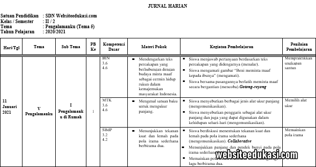 Jurnal kelas 5 semester 2. Silahkan bapak/ ibu guru revisi kembali sesuai dengan hari dan tanggal berdasarkan kalender pendidikan. Download jurnal harian pembelajaran kurikulum 2013 sd kelas 1, 2, 3, 4, 5, 6. Contoh jurnal harian mengajar / agenda guru mungkin bisa digunakan kurikulum 2013 (k13) sebagai catatan kegiatan harian guru mata pelajaran atau guru kelas yang wajib dilakukan seorang guru pada proses sebelum dan sesudah kegiatan pembelajaran. Jurnal harian k13 kelas 2 sd semester 1 dan 2 merupakan salah satu bagian penting dan tidak bisa terpisahkan dengan perangkat pembelajaran pada setiap pelaksanaan kegiatan belajar.