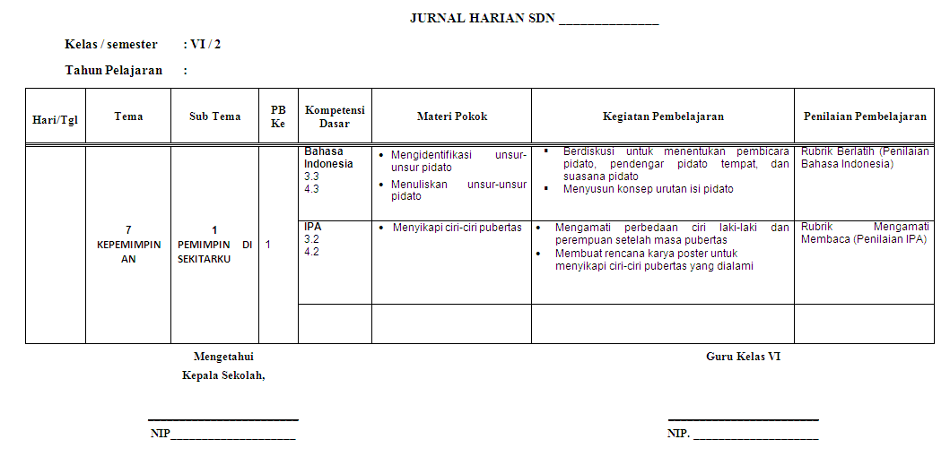 Jurnal harian guru merupakan sebuah catatan penting bagi guru yang mencakup muatan dan mapel kd indikator pencapaian kompetensi. Contoh jurnal mengajar guru sd k13 kelas 1,2,3,4,5,6 revisi terbaru yaitu edisi 2018, perangkat pembelajaran berupa jurnal mengajar guru merupakan salah administrasi yang diperiksan dan disupervisi oleh kepala sekolah dan pengawas Jurnal kelas atau biasa disebut dengan agenda harian adalah salah. Jurnal harian kelas 6 tema 6.doc. Download jurnal harian daring kelas vi tema 6.