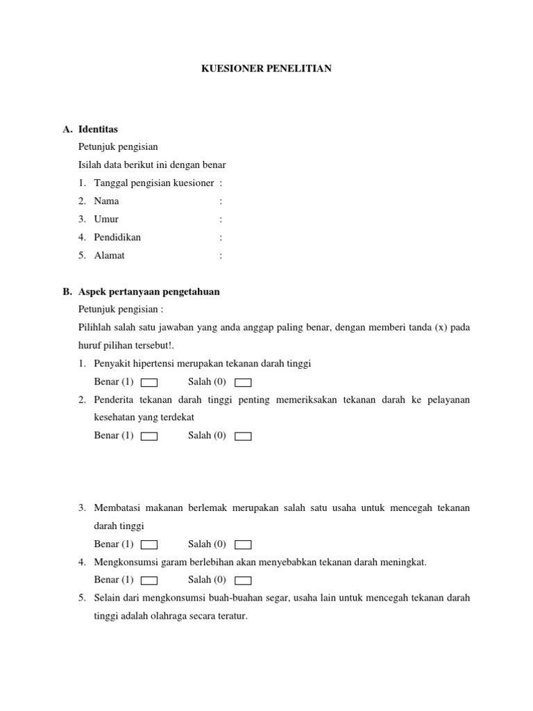Abstrak resiko hipertensi di indonesia termasuk tinggi, perubahan gaya hidup menyebabkan peningkatan prevalensi hipertensi,pola diet dan kebiasaanberolahraga dapat rnenstabilkantekanan darah. Articles, theses, books, abstracts and court opinions. Adalah data yang diperoleh dari kuesioner penelitian yang meliputi data tentang identitas responden, ada atau tidaknya keturunan orang tua dengan penyakit hipertensi, umur responden, data hasil pengukuran tekanan darah, dan data berat badan dan tinggi badan.data sekunder yaitu data yang diperoleh Jenis penelitian survey analitik dengan desain potong lintang. Contoh kuesioner penelitian / angket penelitian buat kamu yang mau melakukan penelitian, di bawah ini saya berikan contoh kuesioner penelitian oleh salah satu mahasiswa di suatu kampus.