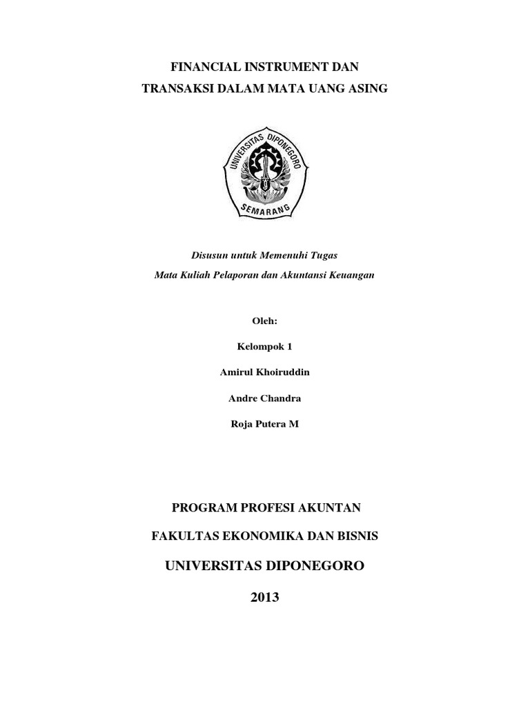 Makalah transaksi dalam mata uang asing, derivatif dan lindung nilai bab i pendahuluan 1.1. Kali ini dari tim akuntansi keuangan akan membahas tentang akuntansi multinasional, khususnya transaksi mata uang asing ( foreign currency transactions) yang merupakan aktivitas ekonomi yang dinyatakan dalam mata uang selain dari mata uang pencatatan suatu entitas. Pada dasarnya, alur akuntansi atas transaksi bermata uang asing adalah sebagai berikut : Untuk maksud ini, instrumen ekuitas entitas sendiri tidak mencakup instrumen keuangan yang dapat dijual dengan harga tertentu di masa depan (puttable financial instrument). Pada saat terjadinya transaksi pertama kalinya, nilai transaksi diakui atau dicatat sebesar nilai fakturnya (invoice) pada setiap pelaporan, transaksi tersebut di translasikan dengan mengkonversikan nilai transaksi tersebut ke dalam mata uang fungsionalnya (rupiah) sesuai dengan metode konversi yang. Kita akan memfokuskan hal ini pada pelaporan laporan keuangan dengan menggunakan mata uang rupiah. Sama seperti mata uang lainnya, valas juga memiliki nilai kurs yang resmi dan tercatat dalam bank sentral. Valas secara sederhana bisa didefinisikan sebagai mata uang yang digunakan sebagai alat pembayaran pada transaksi perdagangan internasional.