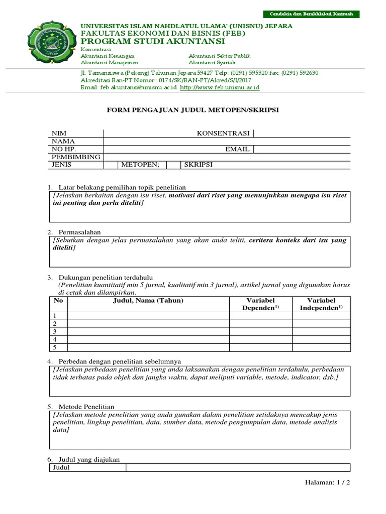 Skripsi contoh format pengajuan judul skripsi halo sahabat mb dimana pun anda berada di bawah ini saya akan memaparkan tentang format skripsi yang berisikan contoh format pengajuan judul skripsi terbaru. Dibawah ini merupakan contoh pengajuan judul skripsi, bagi mahasiswa yang akan mengajukan judul, dapat langsung dicopas, tapi bagi yang ini yang sudah jadi dalam format ms.word agan tinggal klik link berikut : Kami juga menyarankan agar anda mendapatkan informasi lainnya yang juga tidak kalah penting yaitu 100 contoh judul skripsi manajemen pemasaran paling menarik 2017 dan juga 150 contoh judul skripsi akuntansi perpajakan s1 terbaru. Research gap adalah perbedaan hasil peneliti terhadap variabel dependen. Proposal pengajuan judul skripsi perancangan aplikasi penjualan pulsa elektrik all operator untuk reseller berbasis android oleh: Demikianlah resume contoh jurnal yang tersedia dalam database kami. Hukum tata negara fakultas syariah uin maliki malang. Komplek gelanggang pemuda cisaat, jl. Proposal pengajuan judul skripsi 1. Halaman judul halaman judul karya ilmiah berisi tulisan yang sama dengan halaman sampul, namun dicetak di atas kertas ukuran a4 putih dengan maksimum 20 kata unntuk proposal dan skripsi, 12 kata untuk jurnal dalam judul. Contoh jurnal skripsi gunadarma 1. Dosen pembimbing menguji pemahaman mahasiswa terkait judul yang diajukan (didukung dengan bukti referensi yang relevan) Contoh research gap akuntansi, manajemen pemasaran, manajemen keuangan dan manajemen sdm.