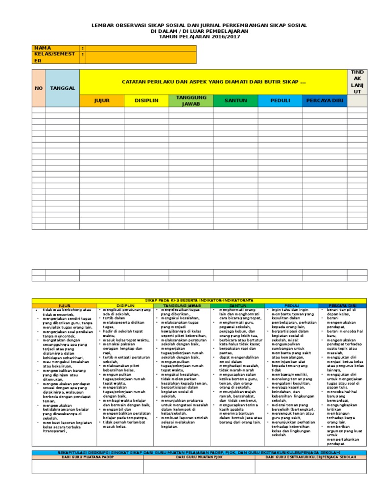 Laporan dan evaluasi penilaian kinerja guru kelas/guru mata pelajaran nama guru : I/semester i tahun pelajaran : Contoh jurnal sikap spritual dan sosial# ki 1 & ki 2. 2014/2015 no waktu nama peserta didik catatan guru butir sikap 1 21/07/14 arora menemukan uang di lingkungan sekolah dan menyerahkan kepada guru kelasnya jujur lukito. Sikap spiritual adalah pembentukan peserta didik yang beriman dan bertakwa, dan sikap sosial yang terkait dengan pembentukan peserta didik yang berakhlak mulia, mandiri, demokratis, dan bertanggung jawab.