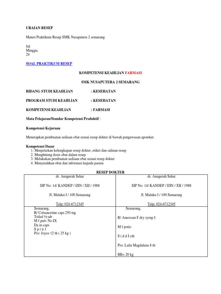 Contoh soal praktikum ilmu resep smk farmasi. Contoh tata tertib dan sanksi di laboratorium resep tata tertib praktikum resep siswa masuk ruang praktik 15 (lima belas) menit sebelum waktu praktik. Serbet/ lap tangan (2) sendok tanduk (1) sendok porselin (1) sudip mika berbagai ukuran (@ 2)… Berdasarkan resep diatas, lengkapilah jurnal resepnya : 25 mejayan caruban dokter : Topik k3 lainnya yang bisa anda pelajari adalah contoh komunikasi vertikal, contoh buku laporan harian satpam, prosedur k3 yang berlaku di industri, tugas 3 membaca teks anekdot dalam puisi, soal. Obat saraf otonom analgetika, antiemetik, anti obat saraf otonom 5. Jurnal praktikum ilmu resep resep 4.