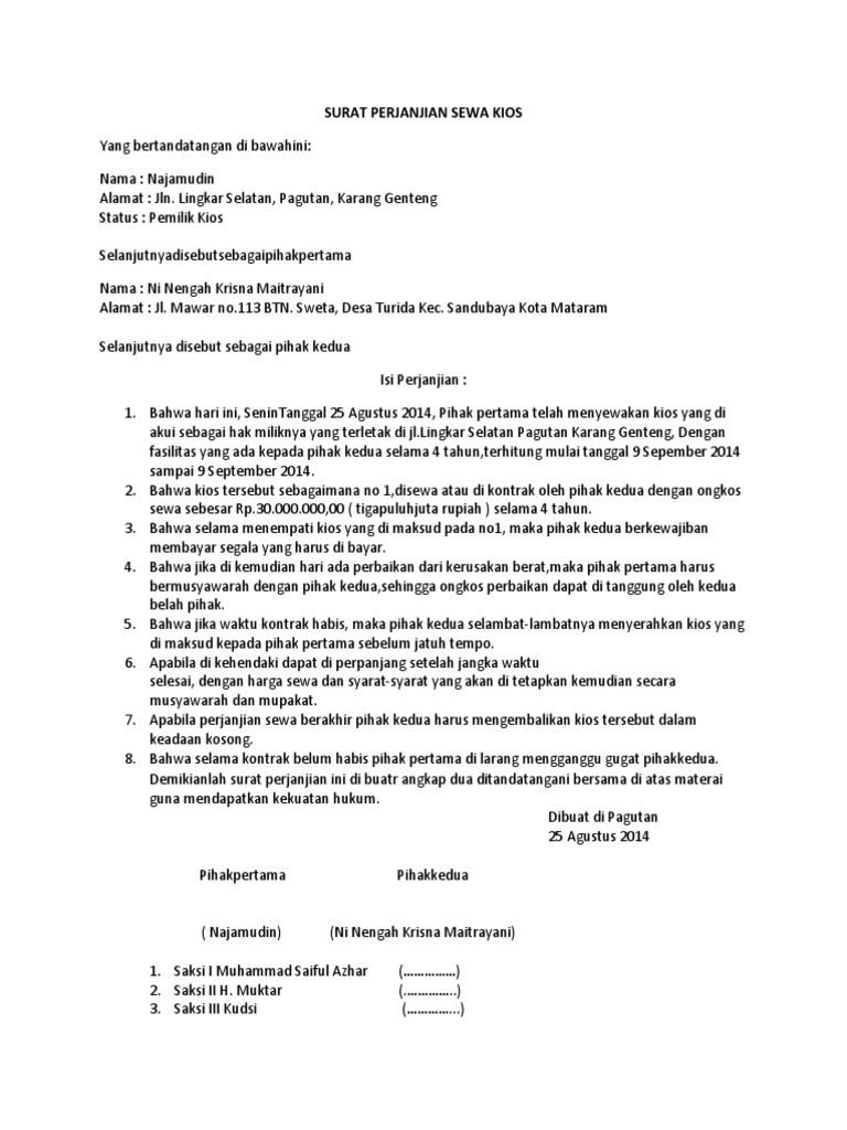 Sewa menyewa kios dilangsungkan untuk jangka waktu 1 (satu) tahun terhitung sejak tanggal 15 juli 2009 sampai dengan 15 juli 2010. Contoh surat perjanjian sewa kerja jual beli hutang. Anda sedang membuka postingan contoh surat perjanjian sewa kios yang berada pada kategori contoh surat dengan tag postingan berikut contoh terimakasih telah berkunjung di gawe cv pada post contoh surat perjanjian sewa kios. Gudang merupakan salah satu aspek terpenting dalam suatu usaha termasuk perusahaan. Yang bertanda tangan dibawah ini Biaya sewa selanjutnya membahas mengenai biaya sewa ruko/kios tersebut secara jelas dan detail. Toko merupakan bangunan yang terkesan mewah biasa menjual barang khusus. Jika kamu ingin melihat contoh jurnal skripsi, kamu bisa melihat preview yang kami sediakan di bawah ini. Contoh surat perjanjian sewa kedai di perumahan. Pengertian dari jurnal sendiri yaitu karya tulis ilmiah yang memiliki isi jurnal ilmiah merupakan majalah publikasi yang di dalamnya memuat karya tulis ilmiah yang mengandung fakta, data, serta informasi yang. Termasuk di dalamnya adalah proses pembayaran, metode yang digunakan serta jangka waktu pelunasannya. Semua pembaca, mari kita lanjutkan diskusi kita tentang dunia korespondensi. Basuki tailor milik tn agus selama bulan oktober 2014 mempunyai transaksi sebagai berikut: