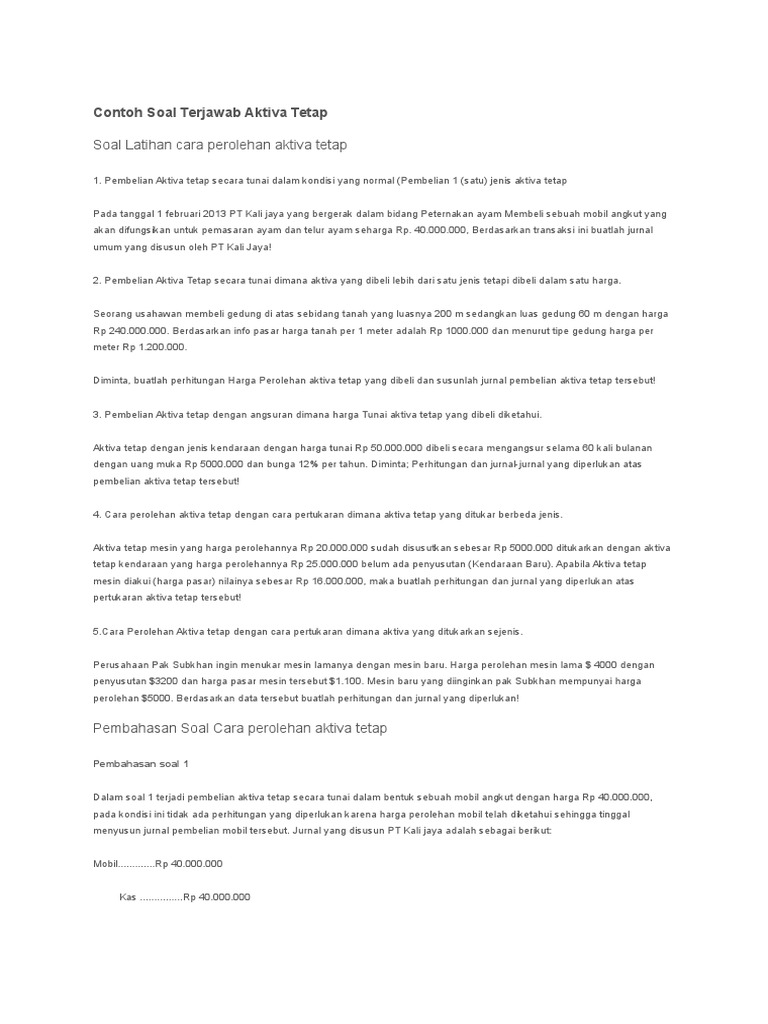 Contoh pertama, misalnya terjadi transaksi pembelian kendaraan senilai 100.000.000 secara tunai. Fungsi, jenis, perhitungan dan pencatatan jurnalnya. Contoh kasus audit aset tetap dan penyelesaiannya terjadi pada pt masraffi yang membeli kendaraan dengan harga rp 7.000.000, biaya registrasi kendaraan rp 600.000, biaya kirim kendaraan rp 500.000 dan ppn rp 810.000. Perusahaan mempunyai mesin dengan cost rp 80.000.000 umur ekonomis 10 th, metode depresiasi yang dipergunakan metode garis lurus. Nah, nilai aktiva tetap ini diketahui dapat mengalami penambahan atau.