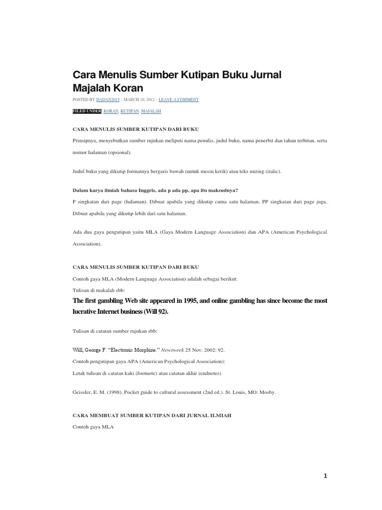 Adapun cara menulis kutipan dari sumber skripsi adalah sama dengan mengutip dari jurnal. Di bawah ini akan dijelaskan tentang cara menulis kutipan dari internet dalam karya ilmiah. Budaya politik yang berkembang di suatu bangsa sangat berpengaruh terhadap jalannya sistem pemerintahan (rustaman & lubis, 2011). Menurut mercubuana.ac.id , kutipan merupakan pernyataan atau keterangan yang diambil dari teks acuan. Kutipan diapit dengan tanda kutip/petik dua (…) setelah kutipan, tulis sumber yang berupa nama pengarang, tahun terbit, dan nomor halaman di dalam tanda kurung. Hampir sama dengan sebelumnya, untuk mengutip sebuah kutipan dari jurnal dan digunakan dalam sebuah skripsi, pedoman yang digunakan pada cara mengutip dari jurnal penelitian. Kutipan merupakan bagian dari pernyataan, pendapat, buah pikiran, definisi, rumusan atau penelitian dari penulis lain, atau penulis sendiri yang telah (menurut penulis kata telah harus dihilangkan) terdokumentasi, serta dikutip untuk dibahas dan ditelaah berkaitan dengan materi penulisan (azahari, 2005: 11 cara menulis kutipan dari internet jurnal dan skripsi lengkap.