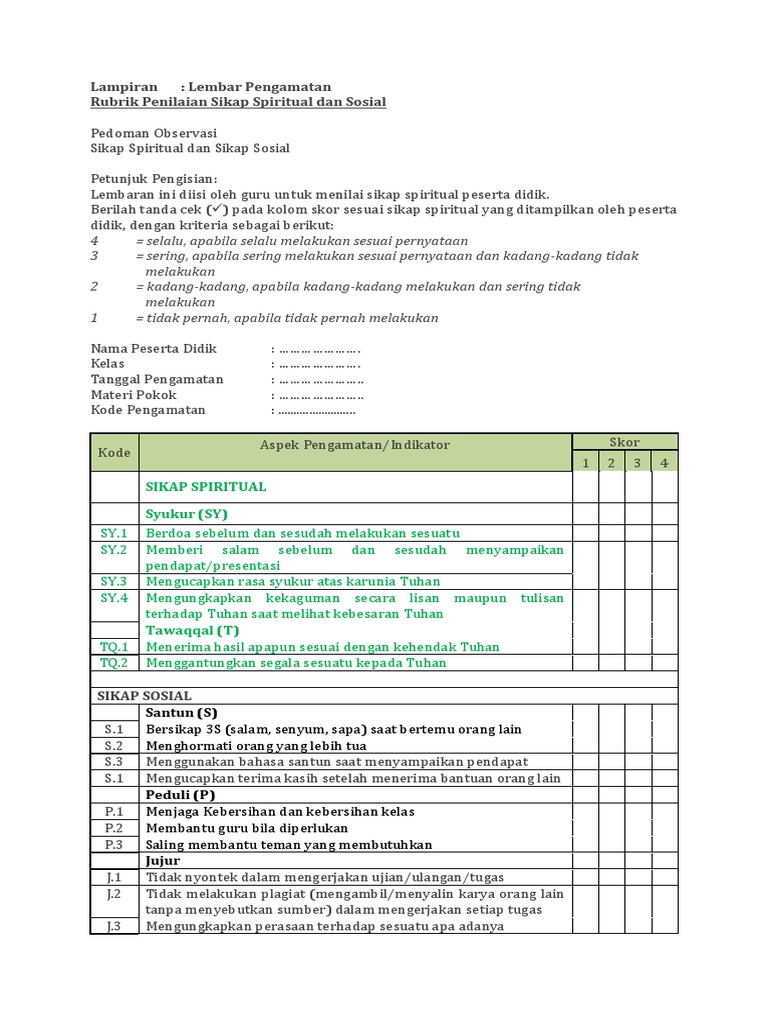 2 instrumen ini diisi oleh guru yang mengajar peserta didik yang dinilai b petunjuk pengisian berdasarkan pengamatan anda selama dua minggu terakhir. Kurikulum 2013 membagi kompetensi sikap menjadi dua, yaitu sikap spiritual yang terkait dengan pembentukan peserta didik yang beriman dan bertakwa, dan sikap sosial yang terkait dengan pembentukan peserta didik yang berakhlak mulia, mandiri, demokratis, dan bertanggung jawab. Mengelola sekolah, pembelajaran, lingkungan sekolah, hubungan dengan orang tua. Sd bagimu negeri kelas/semester : Tidak mengikuti sholat jumat yang diselenggarakan di sekolah.