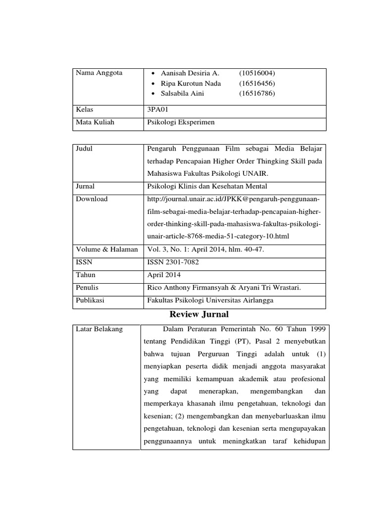 Tujuan penulisan critical journal report (cjr) mengkritik jurnal (critical journal review) ini dibuat sebagai salah satu referensi ilmu yang bermanfaat untuk menambah wawasan penulis maupun pembaca dalam mengetahui kelebihan dan kekurangan suatu jurnal, menjadi bahan pertimbangan, dan. Jurnal psikologi pendidikan dan konseling vol 1 no. Contoh review jurnal review jurnal psikologi i.a. Peningkatan minat belajar seni tari melalui hypnoteaching di sd negeri 1 prambanan klaten. Semoga review ini dapat bermanfaat bagi pembaca.