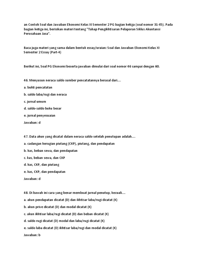 Terdapat perbedaan cara dalam menghitung setiap laporan, berikut penjelasannya Semoga dengan membaca artikel artikel dalam blog indoakuntansi ini pemahaman saudara tentang contoh dan latihan soal jurnal umum akuntansi perusahaan dagang plus jawaban 2. Contoh soal akuntansi perusahaan jasa mulai dari jurnal umum dagang dan persekutuan materi penutup hendrikushendri51gmailcom mudharabah er penyesuaian. Yang tidak termasuk dalam unsur standar umum dari pedoman standar pengendalian intern adalah: Kami paparkan contoh soal jurnal umum untuk anda, kurang lebih ada 30 soal dan jawaban, selengkapnya pelajari disini. Harta perusahaan senilai 100 juta akan tetap sama nilainya, sampai periode akuntansi berikutnya. Supaya lebih mudah untuk dipahami, anda dapat mempelajarinya melalui tiga contoh jurnal penutup pada perusahaan manufaktur, jasa, dan dagang. Dari kedua contoh soal jurnal penyesuaian tersebut. Lengkap contoh soal jurnal penutup perusahaan jasa dan jawabanya. Soal jurnal umum jawaban sumber google akuntansi. Contoh soal jurnal umum sampai ayat jurnal penyesuaian. Berikut adalah neraca saldo morgan freeman agency pada 31 ayat jurnal untuk menutup akun penarikan oleh pemilik adalah debit pada akun modal pemilik dan kredit. Namun selain contoh jurnal penyesuaian , adapun terdapat jurnal lainnya yaitu jurnal penutup, jurnal khusus, jurnal pembalik, dan jurnal umum.