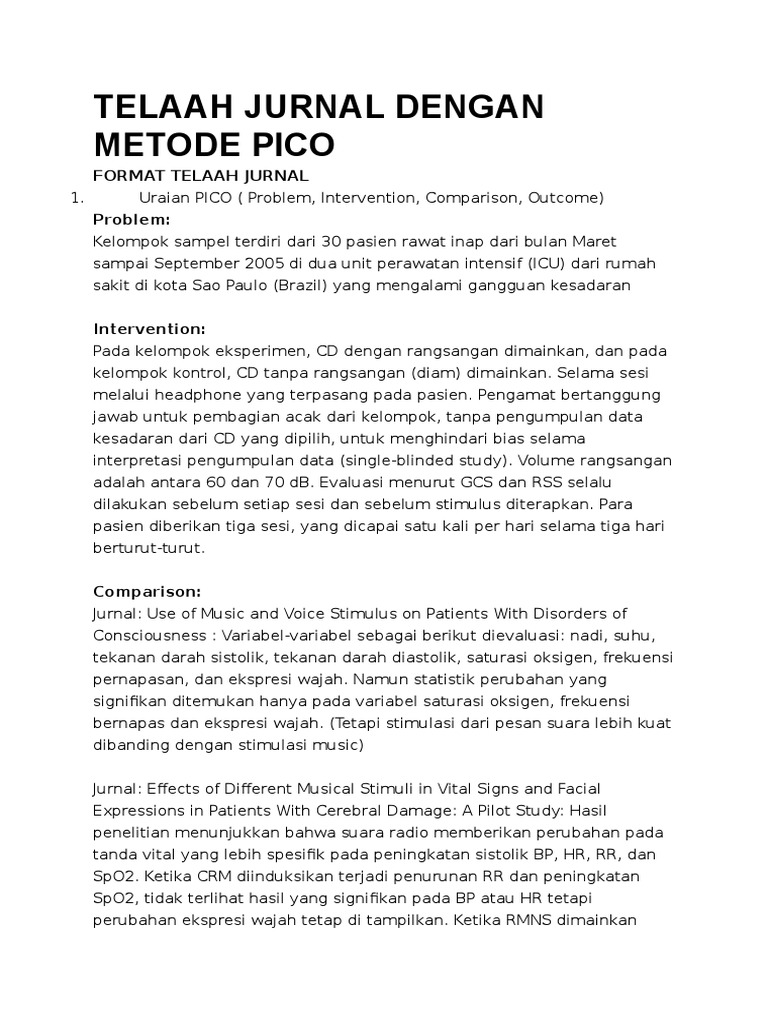 Sudah baik karena mencantumkan tempat penelitian dan tahun penelitian agar lebih jelas lingkupnya. Telaah jurnal ilmiah outlet critical / telaah jurnal nama : Kelompok sampel terdiri dari 30 pasien rawat inap dari bulan maret sampai september 2005 di dua unit perawata… Click to expand document information. Analisis jurnal keperawatan jiwa a. Contoh literatur review / telaah jurnal keperawatan dengan menggunakan metode pico. Contoh telaah jurnal menggunakan picot; Analisis jurnal dengan metode pico nama :