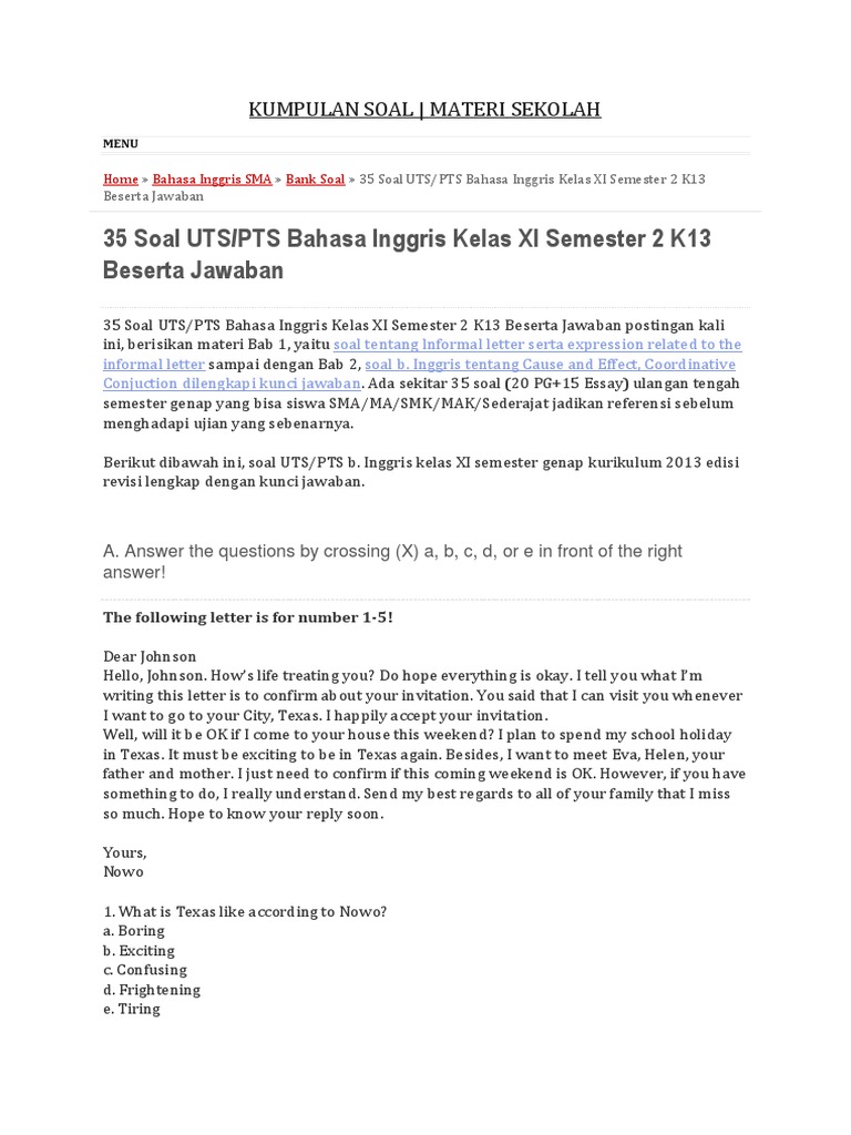Sekianlah pembahasan seputar soal latihan dan jawaban bahasa inggris unbk dan usbn smp kali ini, semoga bisa bermanfaaat untuk kalian semuanya ya. Kunci jawaban soal pts/uts qur'an hadits kelas 1 2 3 4 5 6 madrasah ibtidaiyah semester ganjil kurikulum 2013. Jawaban diketahui dari kalimat while the stock lasts. Inggris kelas x semester genap kurtilas edisi revisi dilengkapi kunci jawaban. B jawaban diketahui dari keterangan di langkah ke 6. Sekianlah pembahasan seputar soal latihan dan jawaban bahasa inggris unbk dan usbn smp kali ini, semoga bisa bermanfaaat untuk kalian semuanya ya. Kunci jawaban buku bahasa inggris kelas xi kurikulum 2013 halaman 14baiklah untuk postingan pertama pada blog ini saya akan memberika kunci jawaban buku bahasa inggris kurikulum 2013 semester 2 khususnya halaman 14 disana ada soal tentang how to make chicken satayberikut. Soal pts ini berbentuk pilihan ganda dan belum tersendia kunci jawaban, jadi adik adik bisa kerjakan dirumah atau kelompok bersama teman teman, selamat mengerjakan ya. Download contoh soal uts bahasa inggris kelas 9 smp/mts & soal pts bahasa inggris kelas 9 smp/mts semester 2 (dua/genap) beserta kunci jawaban tahun pelajaran 2020/2021 kurikulum 2013 (k13). Percakapan yang dibacakan oleh bapak/ibu guru: 1# rangkuman materi un/unbk bahasa inggris sma/smk/ma/mak: