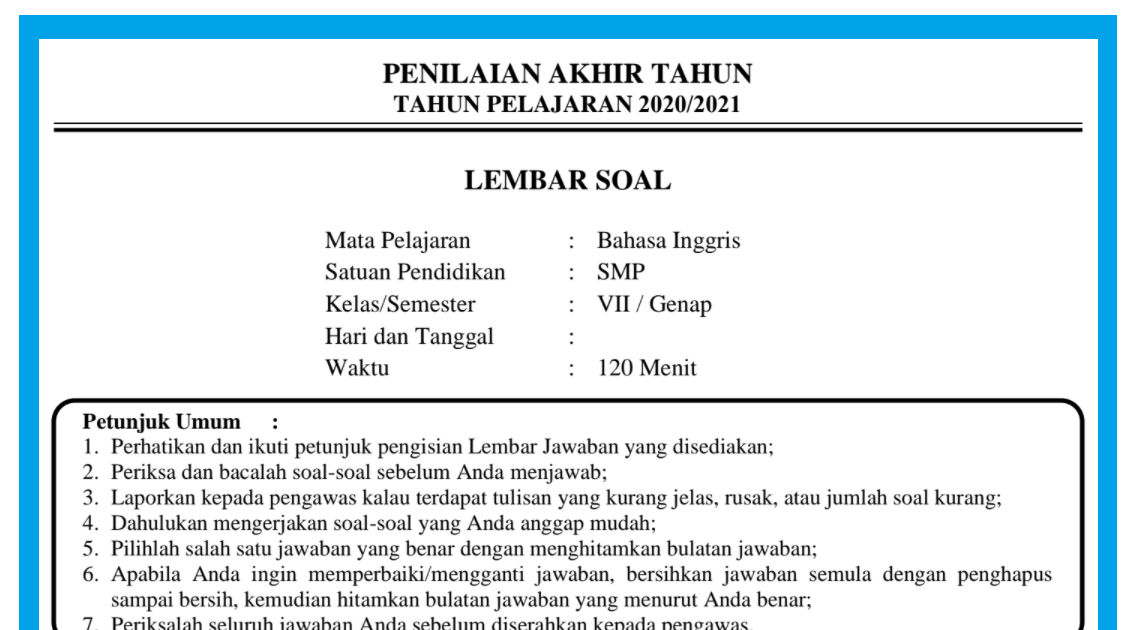 Sekianlah pembahasan seputar soal latihan dan jawaban bahasa inggris unbk dan usbn smp kali ini, semoga bisa bermanfaaat untuk kalian semuanya ya. Silahkan download file pdf berisi soal pts bahasa inggris kelas 7 semester ganjil pada link download berikut. Berikut ini ialah contoh penggalan teks laporan yang disusun atas dasar pola urutan waktu yaitu … a. Silahkan cek kunci jawaban untuk soal pts bahasa inggris kelas 7 semester ganjil di atas. Pada tingkat sekolah menengah pertama (smp), berbeda dengan tingkat sekolah dasar yang masih terpusat pada kosakata (vocabulary), para siswa di tingkat ini belajar lebih jauh mengenai grammar dan kalimat yang lebih kompleks. Nah seperti yang kita ketahui bersama bahawasanya bahasa inggris merupakan bahasa asing yang diapakai untuk seluruh negara di dunia dan dijadikan sebagai bahasa internasional. Contoh soal kelas 7 smp/mts mata pelajara pkn lengkap dengan kunci jawabannya. Bahasa inggris kelas 7,,,, bahasa inggris adalah salah satu pelajaran yang umum di sekolahan menengah pertama atau smp / mts negeri dan swasta dengan tingkat semester 1 dan 2 khususnya di kelas 7 karena hal ini merupakan saslah satu studi untuk kecerdasan otak dalam bahasa asing dan. Pada artikel kali ini kami bertujuan untuk menjadi sarana belajar bagi para siswa yang duduk di bangku. Selamat belajar, semoga postingan tentang 40 soal bahasa inggris kelas 7 smp semester i dan kunci jawaban terbaru bisa bermanfaat dan jangan lupa share ya. Kami menyajikan informasi terkait bank soal bahasa inggris smp kelas 7 dan kunci jawaban semester 1.