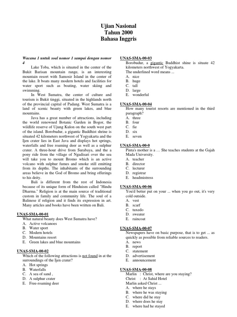 Would ould you min mind d if i carr carryy yo your lugg luggag age e to to you your ro room, om, ma ma'am. Soal kunci dan pembahasan un bahasa inggris sma 2018 ujian nasional sudah di depan mata pemerintah melalui badan standarisasi nasional kunci jawaban bahasa inggris paket 1 7 simulasi un tahun 2019 lp2un yogyakarta. Ujian nasional (un) saat ini merupakan kegiatan akhir dari proses pembelajaran siswa selama mengikuti proses pembelajaran di jenjangnya. Singapore came in fourth with 7 points followed by timor leste with 3 points and macau with no points. Latihan soal bahasa indonesia (download) kunci dan pembahasan latihan soal bahasa indonesia (download) latihan. The description of listening unbk bahasa inggris sma/ma 2018 app. D (she is standing next to the table) 3. Listening un bahasa inggris tahun 2013 dan pembahasannya listening un bahasa. Kegiatan mendengarkan khususnya lagu, dialog, berita, podcasts dalam bahasa inggris akan melatih pendengaran kita khususnya dalam bahasa inggris. Try out stmik jakarta sti&k. Erlangga xpress un 2019 bahasa indonesia detik persiapan ujian nasional.
