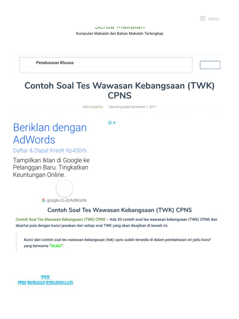 Nah untuk lebih lengkapnya sobat bisa simak ulasannya dibawah ini. Pada tes ini terdiri dari 100 soal dengan kompisisi tes intelegensia umum 35, tes wawasan kebangsaan 30, serta tes karakteristik pribadi 35. Dibawah ini merupakan beebrapa contoh latihan soal cpns twk tema nkri yang sudah dilengkapi dengan kunci jawaban/pembahasan. Anda perlu searching, diskusi, dan mencari. Cpns kali ini menawarkan formasi lebih dari 250 ribu. Tes wawasan kebangsaan, tes intelegensi. Kunci jawaban soal cpns twk lengkap pembahasannya. Seperti yang disampaikan sebelumnya bahwa salah satu kelulusan yang harus dicapai adalah tes oh iya hampir terlupa pada poin contoh soal tes wawasan kebangsaan diatas kami berikan kunci jawaban dari contoh soal itu, jawabannya adalah. Maaf, website ini bukan sekedar soal dan kunci. Contoh soal twk cpns dan jawabannya. Soal #cpns #twk bocoran prediksi soal cpns 2019 hots dan kunci jawaban yang sebagai referensi bekal dalam mengerjakan.