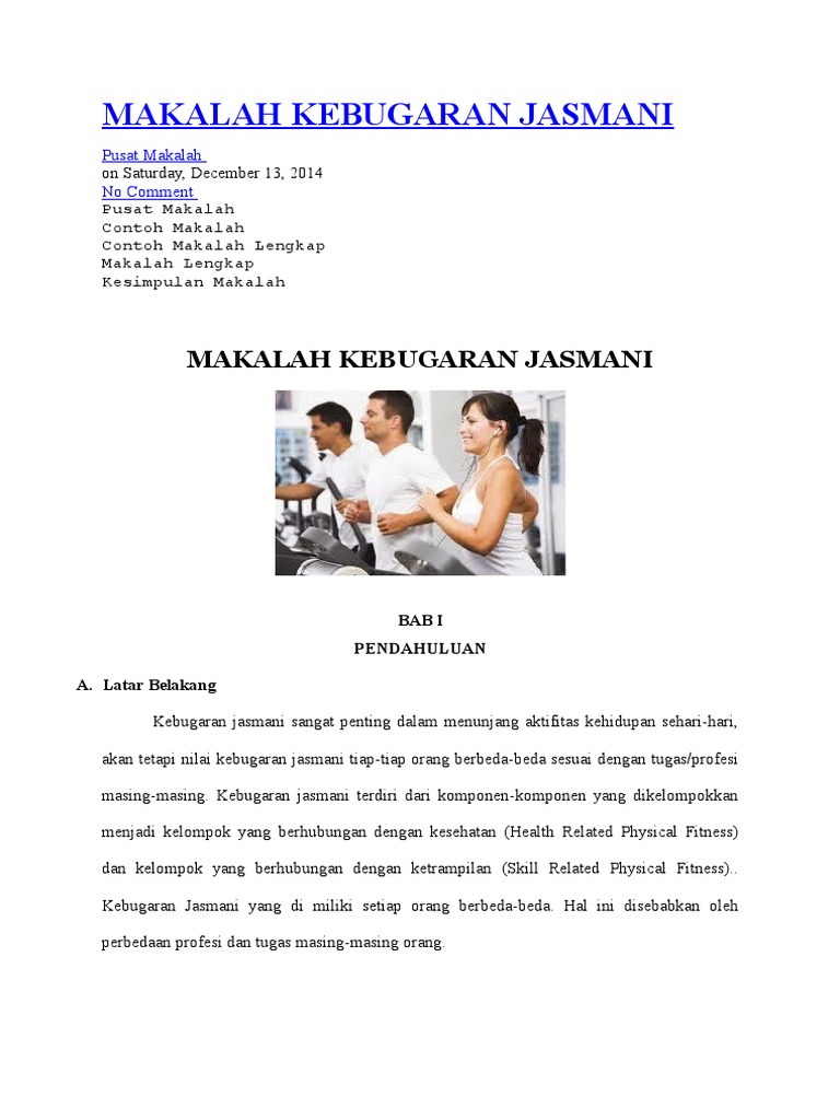 Namun, yang dibutuhkan kebugaran jasmani setiap orang berbeda karena aktivitas yang tak sama. Kebugaran jasmani 2.1.1 definisi kebugaran jasmani kebugaran fisik adalah suatu kondisi fungsional tubuh yang ditandai dengan kemampuan tubuh untuk toleransi beban latihan fisik. Toho cholik mutahir dan ali maksum (2007:53) kebugaran jasmani terdiri dari beberapa komponen kemampuan fisik yaitu: Secara umum komponen kesegaran jasmani terbagi dalam dua tingkat, yaitu tingkat dasar dan tingkat lanjutan. Dan hanya 15% peserta didik mendapatkan materi kebugaran jasmani unsur kecepatan dari. Jurnal ilmiah pendidikan jasmani, 1 (2) 2017. Kebugaran statis dalam arti kata keadaan seseorang yang bebas dari penyakit, 2)kebugaran dinamis dalam arti kemampuan untuk bekerja efisien yang tidak memerlukan keterampilan, mmisalnya berjalan, mengangkat, dll, dan 3)kebugaran motoris dalam arti. Kebugaran jasmani siswa di atas, dan betapa pentingnya arti kebugaran jasmani bagi diri siswa dan manusia pada umunya, maka dipandang perlu dan sangat mendesak adanya pemikiran tentang analisis masalah guru pjok dalam mewujudkan tujuan kebugaran jasmani siswa di sekolah.