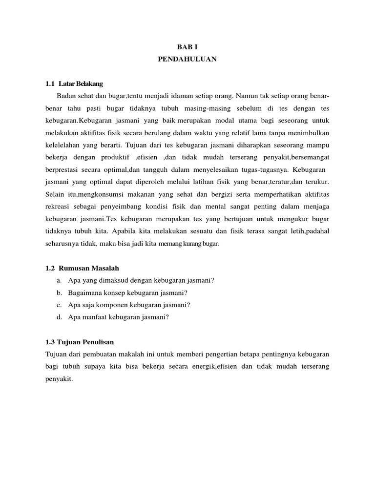 Get Jurnal Contoh Aktivitas Dari Masing-Masing Komponen Kebugaran Jasmani Pdf Gratis. Dengan jasmani yang hugar, hidup menjadi semangat dan menyenangkan. Tingkat kebugaran jasmani kebugaran jasmani jumlah persentase kurang 24 39 % sedang 26 42 % baik 12 19 % total 62 100 % tabel menunjukkan bahwa 24 siswa atau Tergantung dari tingkat kebugaran jasmani seseorang. Pendidikan jasmani adalah suatu proses pembelajaran melalui aktivitas jasmani yang didesain untuk meningkatkan kebugaran jasmani, mengembangkan keterampilan motorik, pengetahuan, perilaku hidup sehat, aktif, sikap sportif, dan kecerdasan emosi. Dari kutipan dapat kita simpulkan bahwa tujuan mata pelajaran