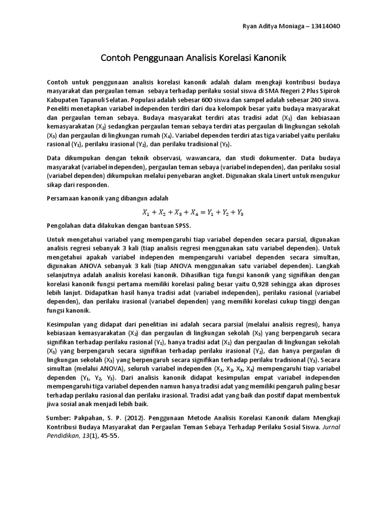 Download Jurnal Contoh Penggunaan Analisi Korelasi Images. Contoh sebuah penelitian dilakukan untuk mengetahui korelasi antara kadar sgot (unit karmen/100ml) dengan kolesterol hdl (mg/100ml) pada 7 sampel yang diambil secara random. Contoh jurnal dalam bahasa inggris tentang correlation. Penggunaan statistical product and service solutions (spss) versi 10.0 dalam analisis korelasi kanonikal memerlukan penulisan sintaks dan penggunaan macro , karena tidak tersedianya fungsi analisis kanonikal dalam menu spss. Koefisien korelasi, koefisien penentu, & analisis regresi. Statistik korelasi yaitu sebuah cara atau metode untuk mengetahui ada atau tidaknya hubungan linear antar variabelnya.