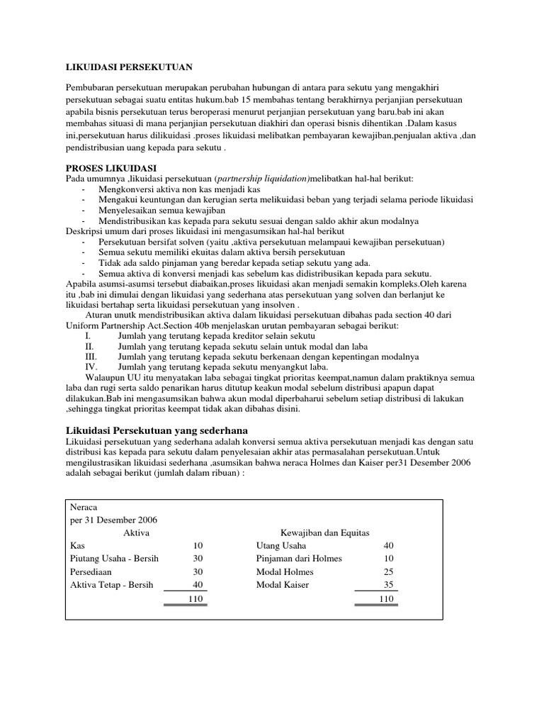 Dalam hal syarat pembubaran perusahaan telah terpenuhi, maka proses likuidasi diawali dengan ditunjuknya seorang atau lebih likuidator. Merger, konsolidasi dan akuisisi adalah salah satu strategi dalam dunia korporasi. Salah satu contoh perusahaan yang mengalami likuidasi di indonesia adalah pt pertamina trading limited (petral). Likuidasi persekutuan likuidasi adalah suatu keadaan dimana baik persekutuan maupun usaha perusahaannya dibubarkan semua. Wachowicz jr yang diterjemahkan oleh dewi fitriasari dan denny arnos kwari, restrukturisasi diikuti dengan adanya perubahan dalam struktur modal, operasi, atau kepemilikan perusahaan yang merupakan rutinitas usahanya.