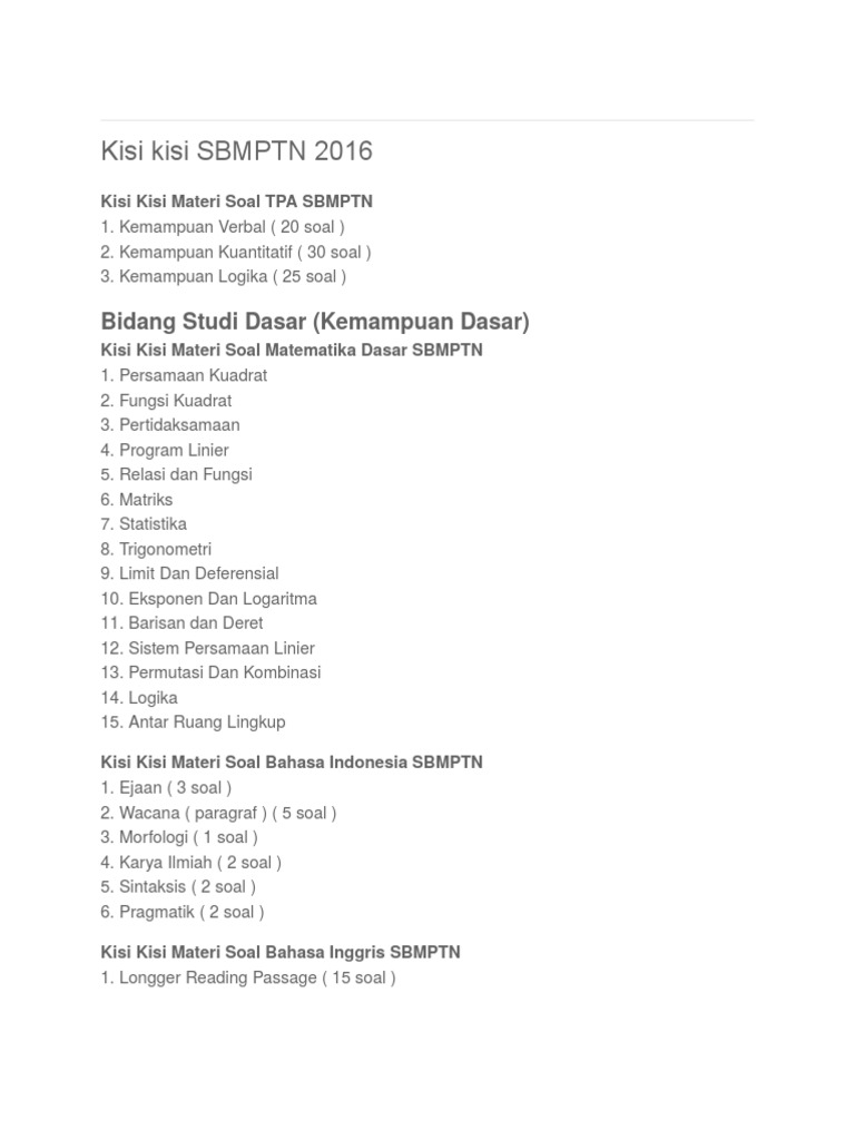Kisi kisi un smk 2019 2020 bahasa indonesia bahasa inggris dan matematika bisa diunduh di sini tribunnews com mobile. Soal sbmptn 2016 tkd saintek dan pembahasan / kunci jawaban download. Sbmptn (seleksi masuk perguruan tinggi negeri) merupakan jalur seleksi masuk ptn dengan menggunakan nilai utbk. Tpa, tkdu, saintek, dan soshum 2016. Selain soal di atas, kalian juga bisa menemukan pembahasan soal bahasa inggris kelas 10 lainnya dengan menekan ini pembahasan soal. Semoga aja masih tetap sama. Sbmptn 2016 merupakan salah satu jenis seleksi yang dilakukan oleh ptn secara bersama di bawah koordinasi panitia pusat dengan seleksi berdasarkan hasil ujian tertulis dalam bentuk cetak (pbt) atau menggunakan komputer (cbt), atau kombinasi hasil ujian tertulis dan ujian keterampilan calon. Silahkan download atau cek seluruh kunci jawaban sbmptn 2015 pada preview file pdf (ukuran file 8,6 mb = 43 halaman) yang ada di posting ini. Matematika dasar, bahasa indonesia, bahasa inggris, verbal berikut ini naskah asli soal latihan sbmptn tahun 2016 dan 2017 guna untuk menghadapi. Kuantitatif + kunci jawaban (download) 5. Selamatkan pasien yang dalam bahaya!