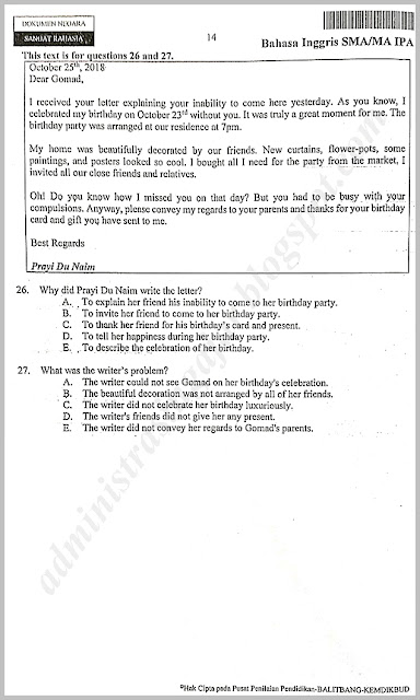 Soal un bahasa inggris sma 2019soal soal yang akan kami bagikan ini merupakan soal scan naskah asli soal yang diujikan pada ujian nasional sma tahun 2019 bulan april lalu jadi dapat dipastikan soal soal ini sama dengan soal yang diujikan jadi. Demikian info lengkap soal latihan dan kunci jawaban ujian sekolah us dan ujian nasional un matematika smp tahun 2020 atau tahun pelajaran 20192020 20182019 20202021 20212022 semoga bermanfaat untuk. Beli kunci jawaban un online berkualitas dengan harga murah terbaru 2021 di tokopedia! Soal usbn bahasa inggris kurikulum 2013. Soal uas bahasa inggris kelas vii k13 merupakan soal uji kemampuan peserta didik dalam memahami materi yang di ajarkan di kelas. Written by admin tuesday, april 30, 2019 add comment edit. Contoh soal ujian nasional unbk 2019 bahasa inggris report text. Kumpulan soal dan kunci jawaban tentang letter soal bahasa latihan online soal un unbk bahasa inggris smp soal bahasa inggris polri dan kunci jawaban, 02 12 2019 berikut contoh soal. Bocoran lengkap soal dan kunci jawab un 2020, semua jenjang bocoran soal un bahasa indonensia smp, bocoran soal un matematika smp, bocoran. Soal dan kunci jawaban unbk geografi 2019 no 1 5. Sebaiknya perlu anda baca terlebih dahulu secara lengkap dan sampai akhirnya.dan ambil kesimpulan dengan baik.